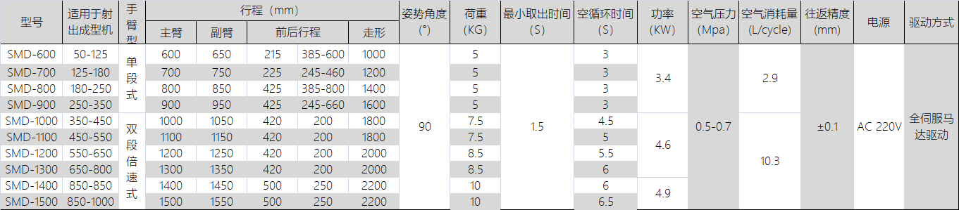 ? ? ? ? 適用于50-3000噸的各型臥式射出成型機,應(yīng)用于外觀及精度要求較高的成品及水口取出.手臂型式有單截式及雙截式,單截式上下行程為700/800/900mm ,雙截式上下行程為800/900/ 1000/1100/1300/ 1500/1700/2000mm。三軸/五軸驅(qū)動使用高性能AC伺服馬達驅(qū)動,具備超高速的取出時間1.4秒、全周時間在5.6秒以肉,高鋼性滑軌傳動,搭配開放式伺服定位控制系統(tǒng),實現(xiàn)高精度取出。